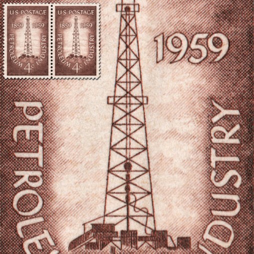 Znaczek w parce upamiętniający stulecie amerykańskiego przemysłu naftowego.