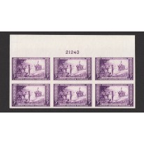 Znaczek nieperforowany w szóstce z marginesem arkusza zawierającym numer kontrolny matrycy.