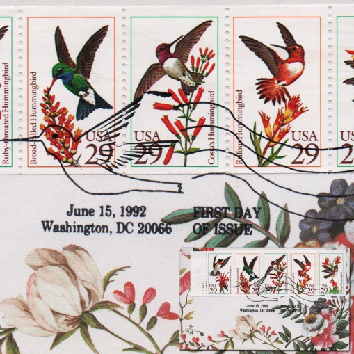 Seria na kopercie pierwszego dnia obiegu, na znaczkach której widnieją następujące gatunki kolibrów: