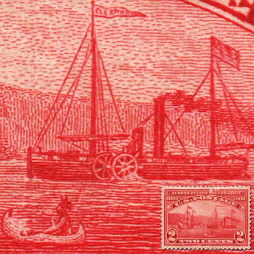 Na znaczku widnieją statki „Clermont” i „Half Moon” na rzece Hudson.