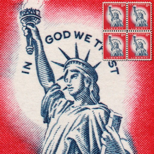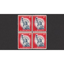 Znaczek w czwórce, na którym widnieje Statua Wolności.