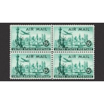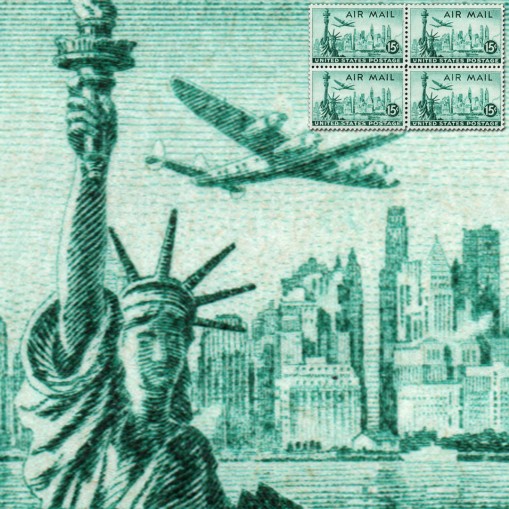 Znaczek lotniczy w czwórce, na którym widnieje Statua Wolności na tle drapaczy chmur Nowego Jorku i samolotu Lockheed Constellation.