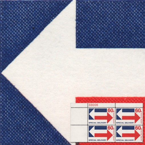 Znaczek w czwórce z marginesem arkusza zawierającym numer kontrolny matrycy [ang. plate block] służący do nadawania przesyłek priorytetowych.
