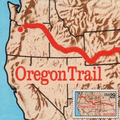 Znaczek upamiętniający 150-lecie szlaku oregońskiego (ang. Oregon Trail), jednego z najważniejszych kierunków migracji osadników na zachód Stanów Zjednoczonych. Pionierzy „Dzikiego Zachodu” podróżowali tym szlakiem krytymi wozami w XIX wieku rozpoczynając liczącą około 3000 km wędrówkę z St. Louis. W latach 1841–1869 droga osadników wiodła przez tereny dzisiejszych stanów: Missouri, Kansas, Nebraska, Wyoming, Idaho i Oregon, aż do wybrzeży Pacyfiku.