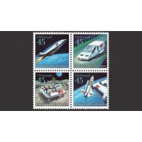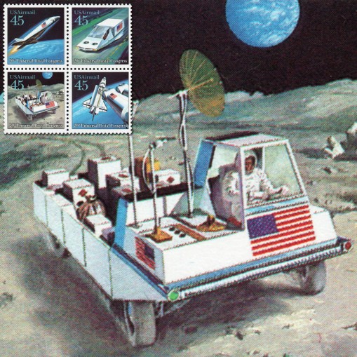 Na znaczkach widnieją różne metody transportu poczty przyszłości:
