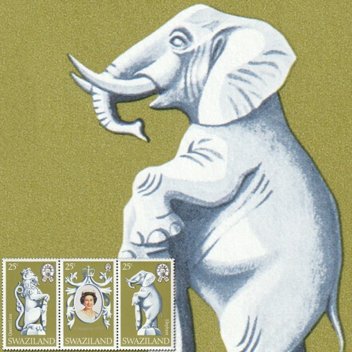 Na znaczkach widnieją kolejno: złoty lew w koronie (rzeźba ta jest jedną z dziesięciu figur heraldycznych reprezentujących genealogię Elżbiety II wykonanych na okazję koronacji monarchini), portret Elżbiety II oraz słoń.