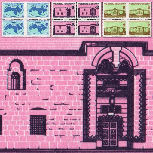Na znaczkach widnieje mapa krajów arabskich oraz budynki akademii arabskiej i uniwersytetu w Damaszku.