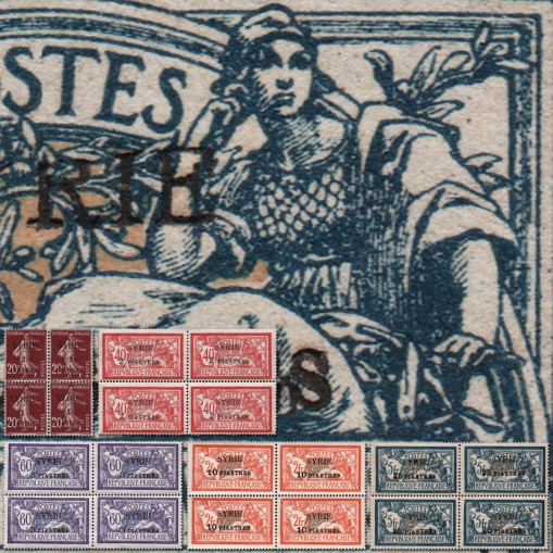 Znaczki wydane pierwotnie we Francji, tym razem z nadrukiem „Syrie” i przedrukiem nominałów.