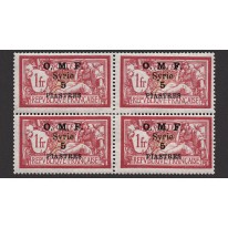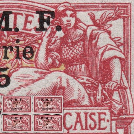 Znaczek wydany pierwotnie we Francji, tym razem z nadrukiem „O.M.F. Syrie” i przedrukiem nominału. Jest to odmiana z wartością nominału i nazwą waluty nadrukowanymi w dwóch linijkach.