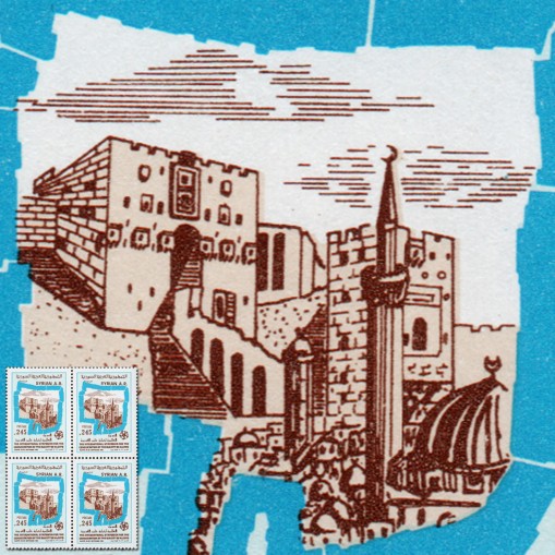 Znaczek w czwórce upamiętniający międzynarodowe sympozjum poświęcone ochronie historycznego starego miasta Aleppo.