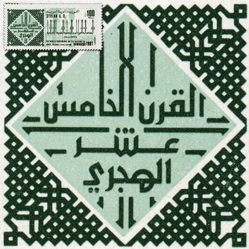 Znaczek upamiętniający światową konferencję poświęconą historii kultury arabskiej i islamskiej w Damaszku.