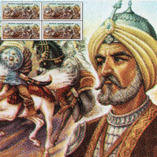 Znaczek w czwórce upamiętniający 800. rocznicę bitwy pod Hittin, w której muzułmańskie siły Saladyna pokonały wojska krzyżowców.
