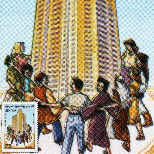 Na znaczku widnieją ludzie dookoła budynku mieszkalnego.