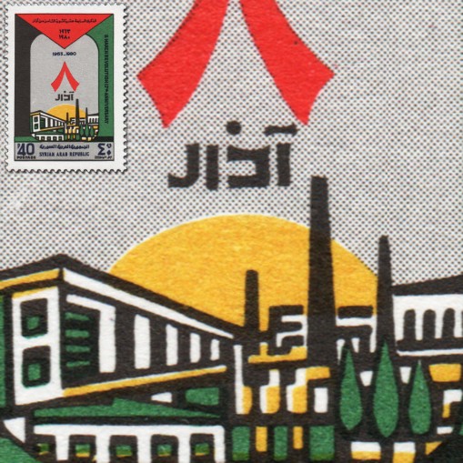 Znaczek upamiętniający 17. rocznicę zamachu stanu w Syrii 8 marca 1963 roku. Przewrót ten zapoczątkował nieprzerwane rządy partii Baas w tym kraju.