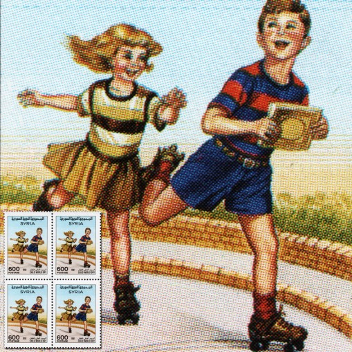 Na znaczku widnieją dzieci jadące na wrotkach.