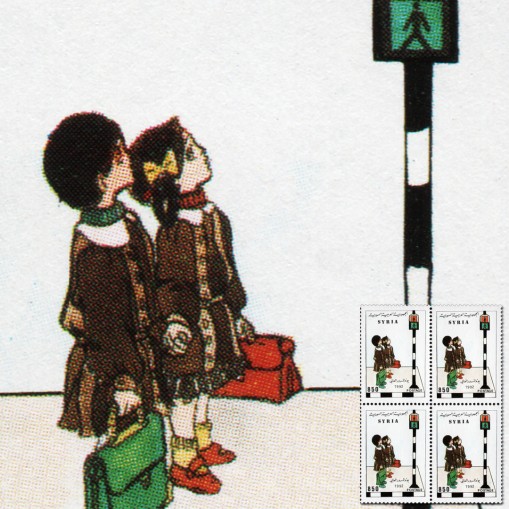 Na znaczku widnieją dzieci przed przejściem dla pieszych.