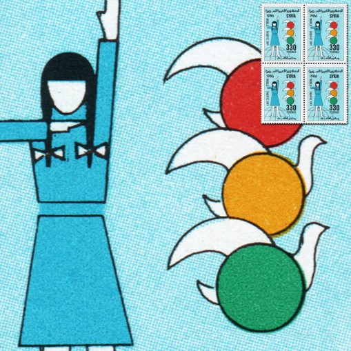 Na znaczku widnieje dziecko i światła drogowe.