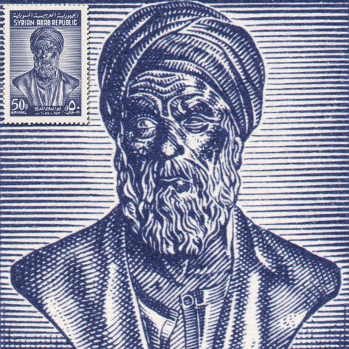 Znaczek upamiętniający 990. rocznicę urodzin Abu al-Ala al-Ma’arri, filozofa, poety i pisarza arabskiego, twórcy racjonalistycznej i sceptycznej koncepcji filozoficznej podważającej dogmaty islamu i odrzucającej pogląd o wyłączności prawdy zawartej w doktrynie religijnej, antynatalista.