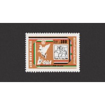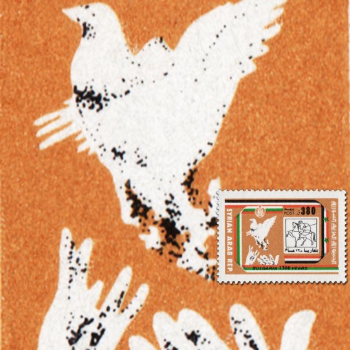 Na znaczku widnieją dłonie wypuszczające gołąbka i jeździec na koniu.