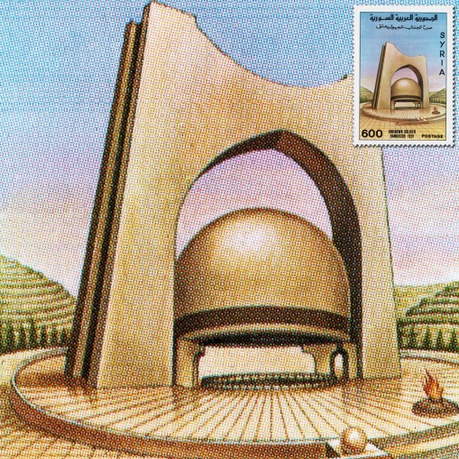 Znaczek, na którym przedstawiono grób nieznanego żołnierza w Damaszku.