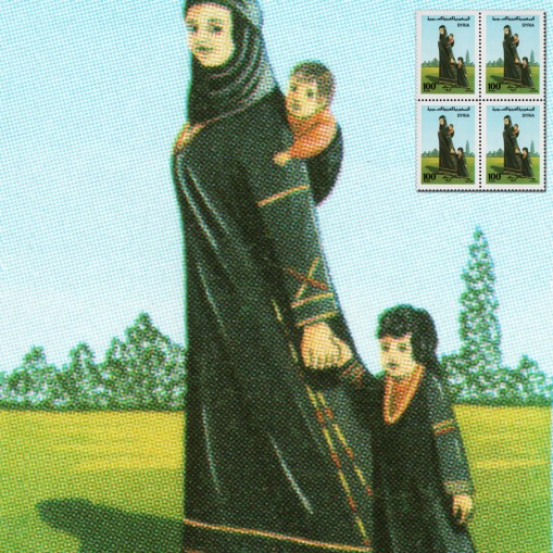 Na znaczku widnieje arabska kobieta z dziećmi.