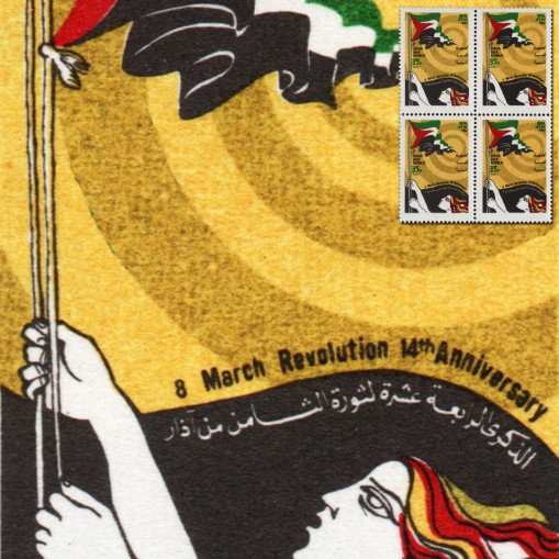 Znaczek w czwórce upamiętniający 14. rocznicę zamachu stanu w Syrii 8 marca 1963 roku. Przewrót ten zapoczątkował nieprzerwane rządy partii Baas w tym kraju.