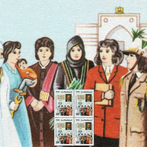 Na znaczku widnieją kobiety pracujące w różnych zawodach i portret prezydenta Asada.