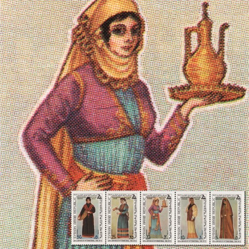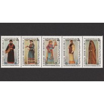 Na znaczkach widnieją kobiety w strojach tradycyjnych.