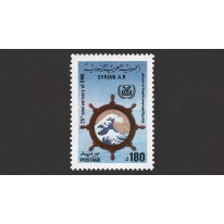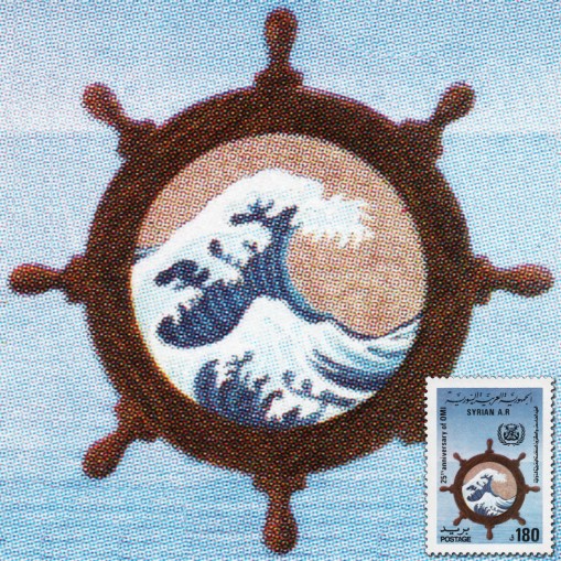 Na znaczku widnieje koło sterowe i fala morska.
