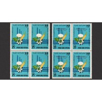Na znaczkach widnieje bawełna, kłos zboża i koło zębate.