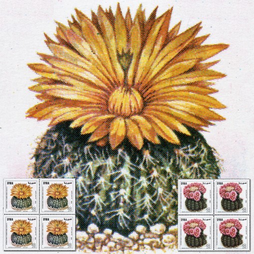 Na znaczkach widnieją kwitnące kaktusy: Mammillaria erythrosperma i Notocactus graessnerii.