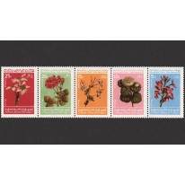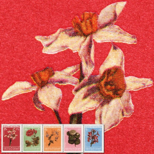 Na znaczkach widnieją kwiaty, kolejno: lewkonia, narcyz wielokwiatowy, róża damasceńska, jaśmin i kamelia japońska.