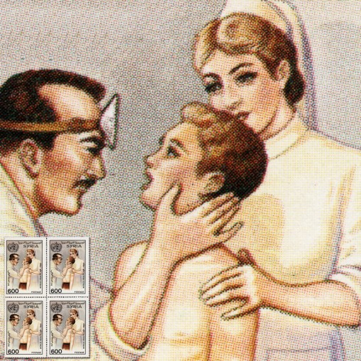 Na znaczku widnieje lekarz badający chłopca w obecności pielęgniarki.