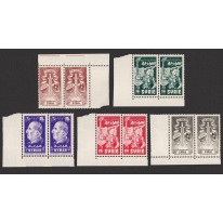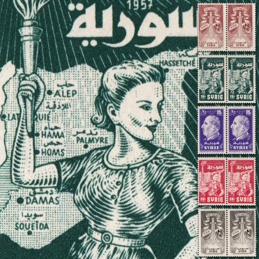 Na znaczkach widnieje miecz wolności, kobieta z zniczem na tle mapy Syrii oraz prezydent Szukri al-Kuwatli.