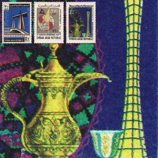 Na znaczkach widnieje wejście na teren targów, kula ziemska oraz syryjskie naczynia miedziane.