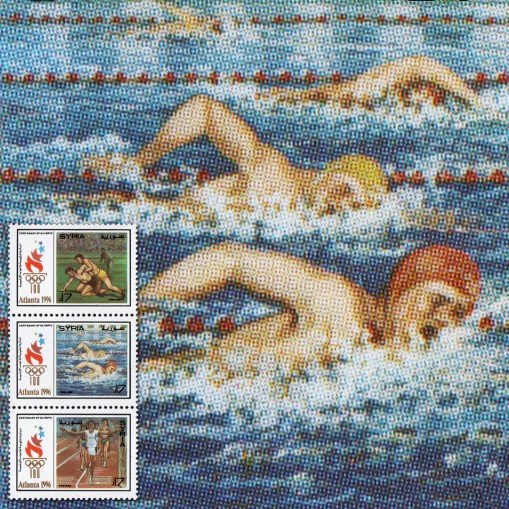 Na znaczkach widnieją zapasy i pływanie, a także Ghada Shouaa, syryjska siedmioboistka, która zdobyła podczas Igrzysk Olimpijskich w 1996 roku jedyny, jak do tej pory, złoty medal olimpijski dla Syrii.