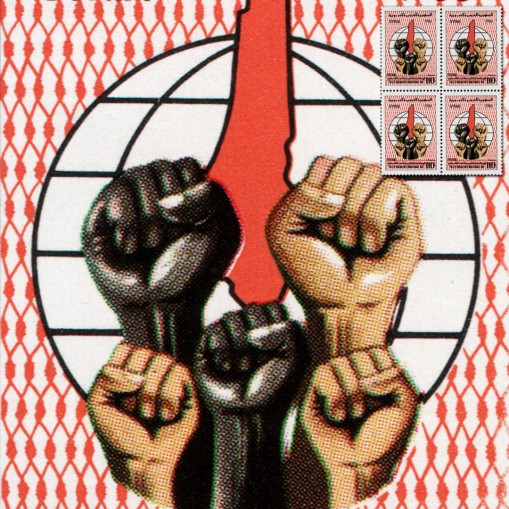 Na znaczku widnieje mapa Palestyny w wzniesione w górę pięści.