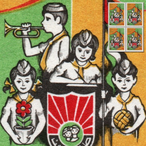 Znaczek w czwórce promujący pionierską organizację młodzieżową partii Baas.