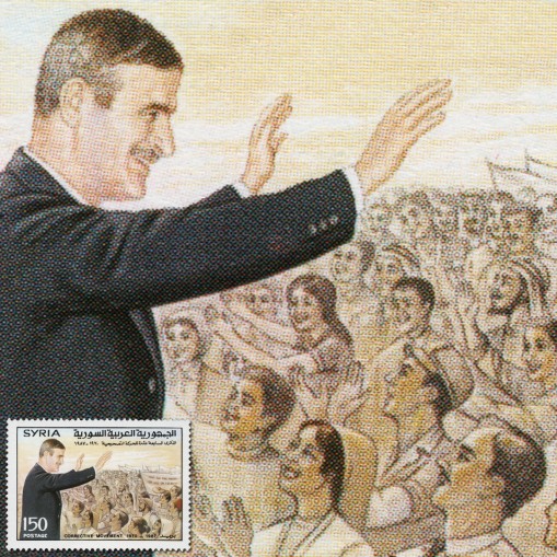 Na znaczku widnieje prezydent Hafiz al-Asad i wiwatujący tłum.