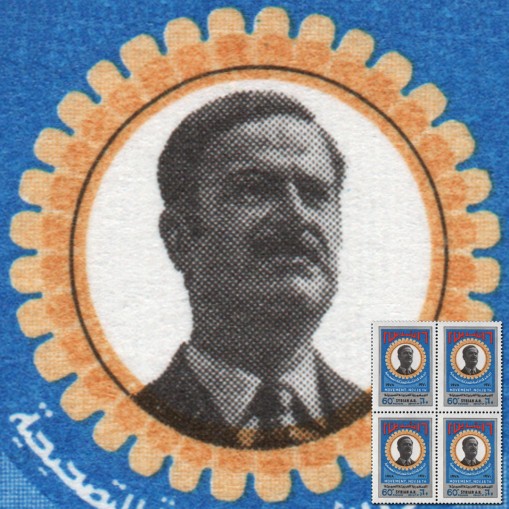 Znaczek w czwórce upamiętniający 8. rocznicę wojskowego przewrotu przeprowadzonego przez Hafiza al-Asada i jego zwolenników w nocy z 12 na 13 listopada 1970.