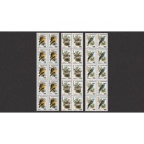 Seria we fragmentach arkuszy po dziesięć znaczków, na których widnieją ptaki: wilga, wróbel i kraska.