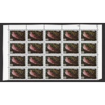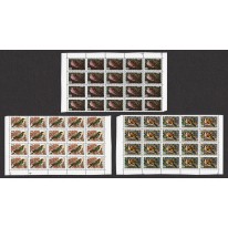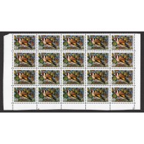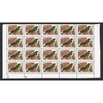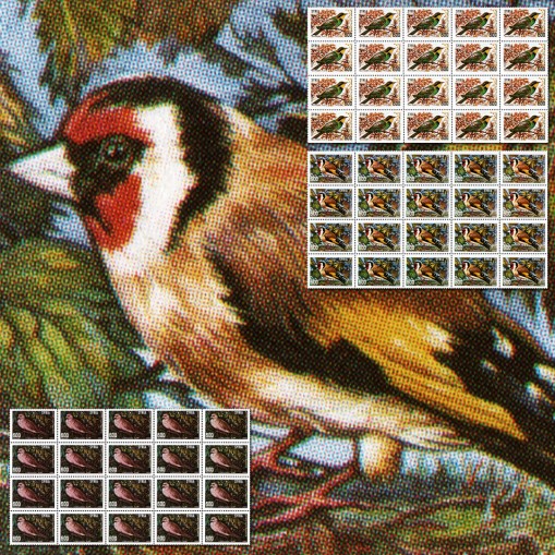 Seria we fragmentach arkuszy po dwadzieścia znaczków, na których widnieją ptaki: żołna, szczygieł i turkawka.