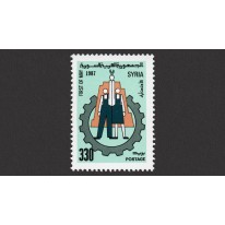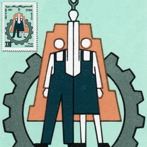 Na znaczku widnieje para robotników wewnątrz koła zębatego.