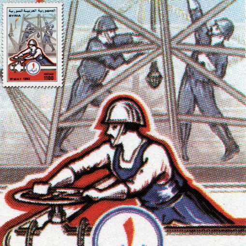 Na znaczku widnieją robotnicy pracujący przy wydobyciu ropy naftowej.