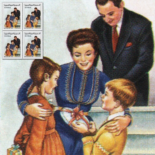 Na znaczku widnieje rodzina składająca matce życzenia.