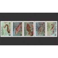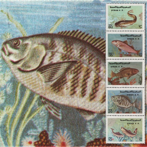 Seria w pasku, na znaczkach której widnieją następujące gatunki ryb: Capoeta damascina, ryba z rodziny prażmowatych, ryba z rodziny strzępielowatych, barwena i sum.