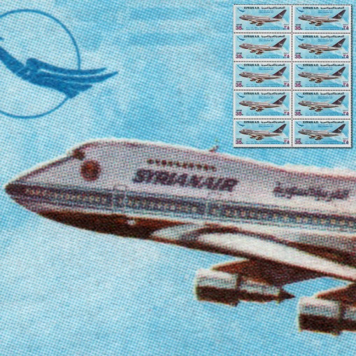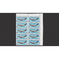 Znaczek w liczącym dziesięć walorów fragmencie arkusza upamiętniający Dzień Awiacji Cywilnej.