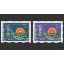 Na znaczkach widnieje zachodzące słońce obok linii wysokiego napięcia i linii kolejowej.