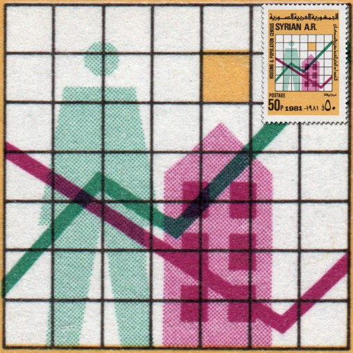 Na znaczku widnieją wykresy oraz sylwetki człowieka i domu.
