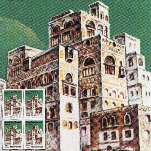 Znaczek w czwórce promujący odbudowę zabytkowego miasta Sana’a w Jemenie.